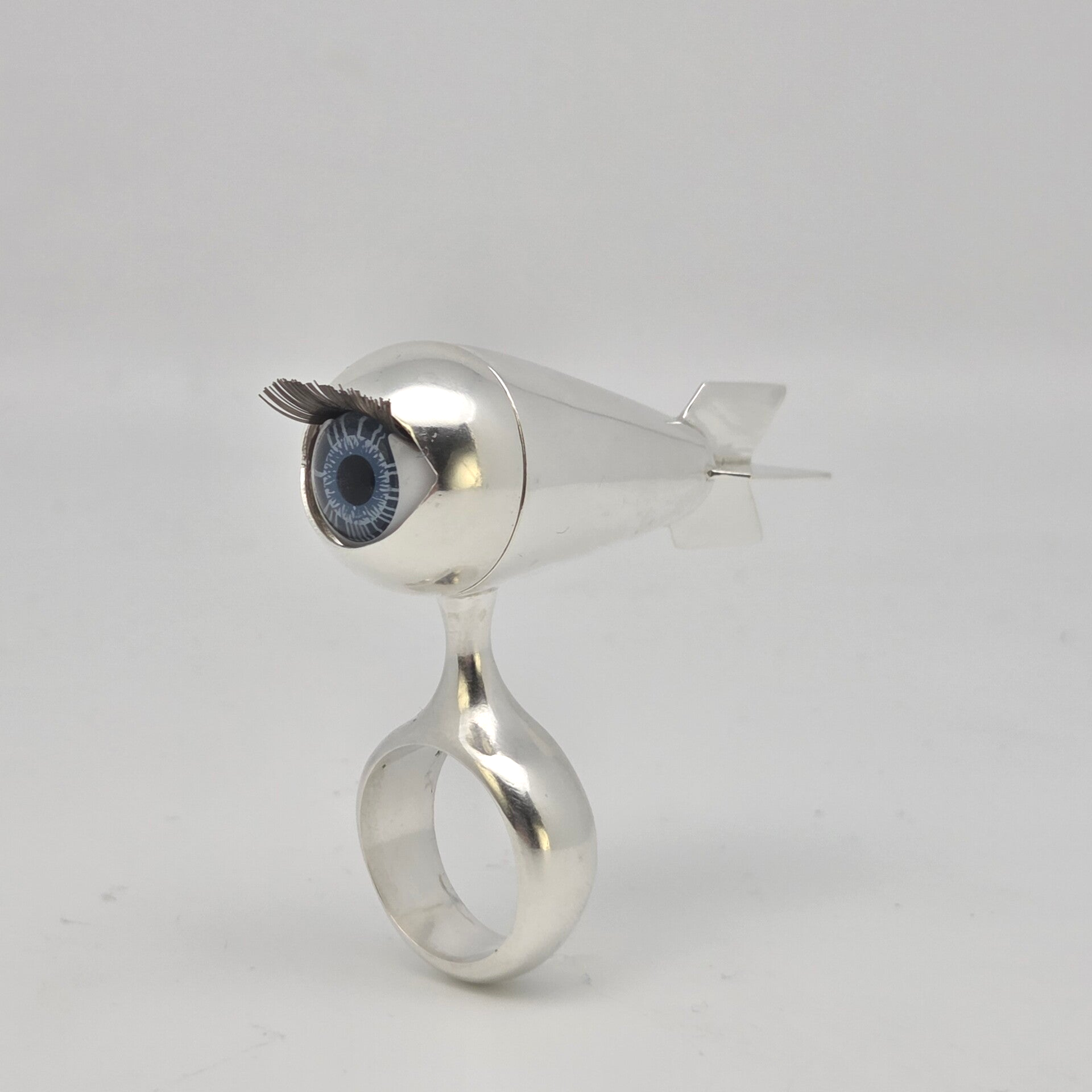 Een van die eerste experimenten was een ring waarop een bloem lag, de wortels van de bloem gingen dwars door de ring, waardoor die niet om de vinger kon worden gedragen. Hieruit kwam de gedachte hoe het zou zijn als de bloem kon openen als je de ring om de vinger deed? De ring oogde futuristisch, space age-achtig. Dat bracht me bij het idee van de space-ringen (zie onder de kinetische bloemen)